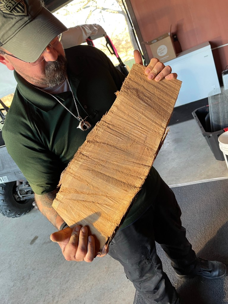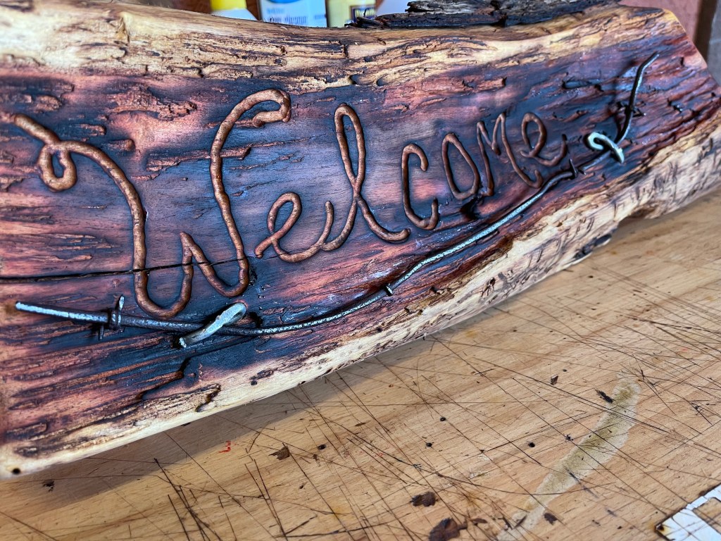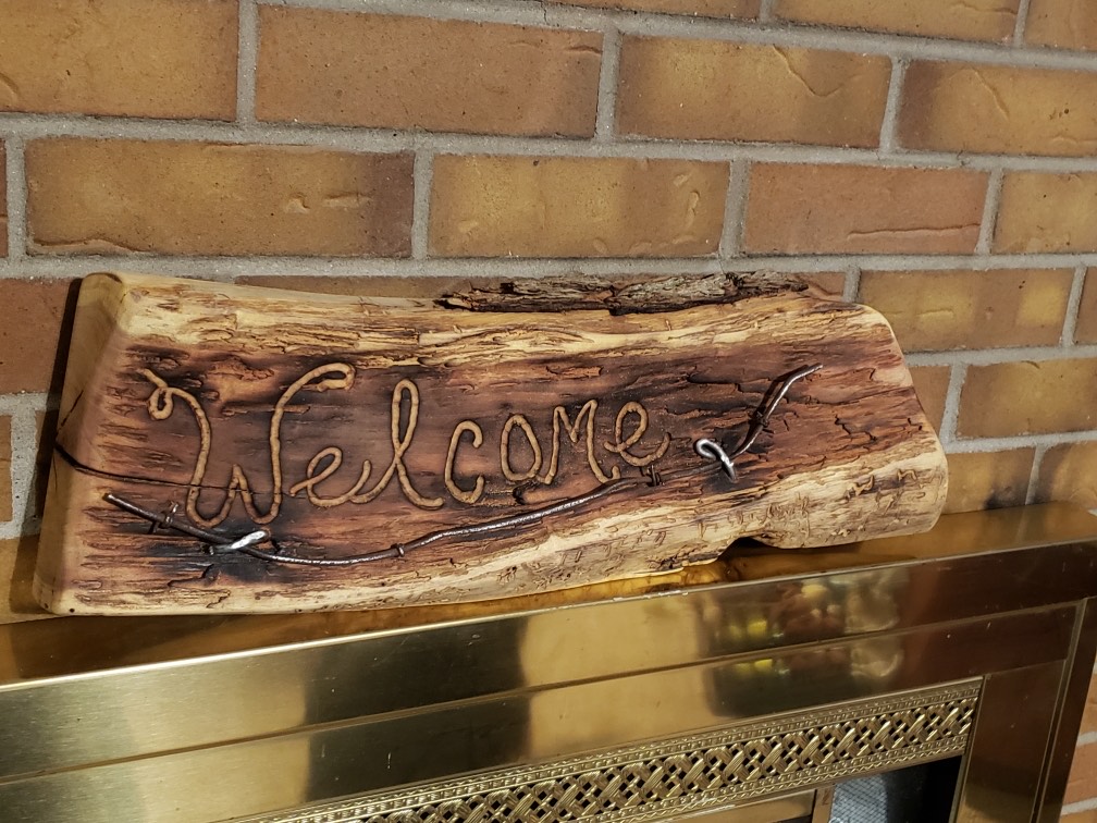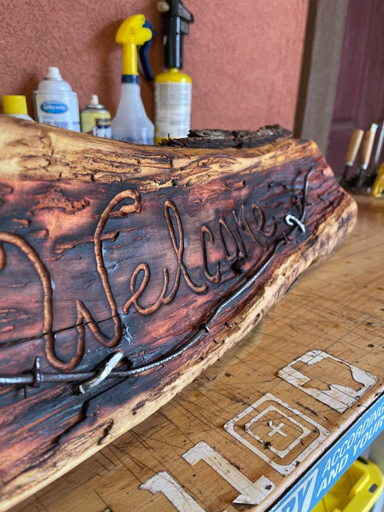 Mom’s birthday was fast approaching, and he wanted to create something unique for her. We had a tree in the front yard that required some trimming, and we were left with a long stump on one side. Josh saw that stump as a piece of art and cut off a section.