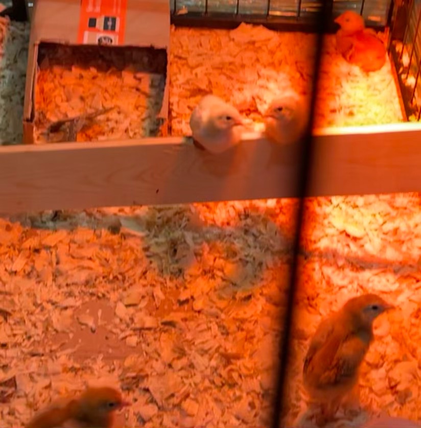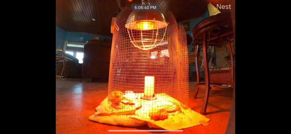 So began my crash course in chick raising. Google told me I need to keep them warm. We had a heat lamp from the freeze. Not ideal, but we were in a hurry. Google told me we needed a cage to contain them. We had some chicken wire that Josh constructed into a small cage. It was too cold for them to go outside so… in the living room they went. This still didn’t solve the problem of us going out of town overnight in the next few days. Enter, Google Home Hub.