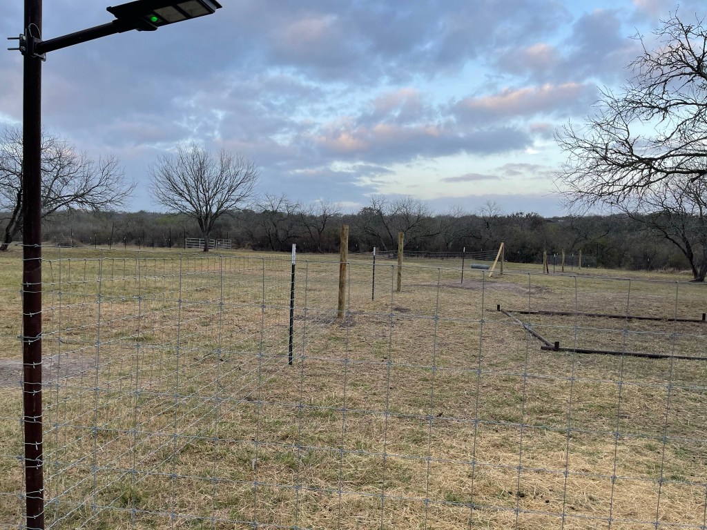 Once we got the stucco repaired, we needed to get the fence finished. Only the top part of the yard was fenced in, but the rest of the property was open to anyone, or anything, that wanted to meander through. The fence was a long process. We knew we could not do it ourselves, so we hired someone to do the work for us. That person turned out to kind of be a snake… live and learn. Regardless, once the fence was finished, we were able to use the back part of our property to house some of the animals. That way they could have more land to run and graze on, and still be safe. We had the fence crew split our back pasture into two areas. Josh decided he wanted to separate them even more, and after watching the fence guys for a few weeks, decided he could do this himself. So… we dug some holes.