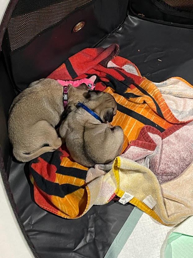 We brought them home on October 22. As of today, they are just over six months old. They have been such a joyful addition to our family! Howdee definitely prefers me, while Penelopee prefers Josh. We think Howdee was the runt of the litter, as he has always been a bit smaller than Penelopee. She is definitely in charge! If they bark, Penelopee starts it. Howdee always looks to her to see what to do.