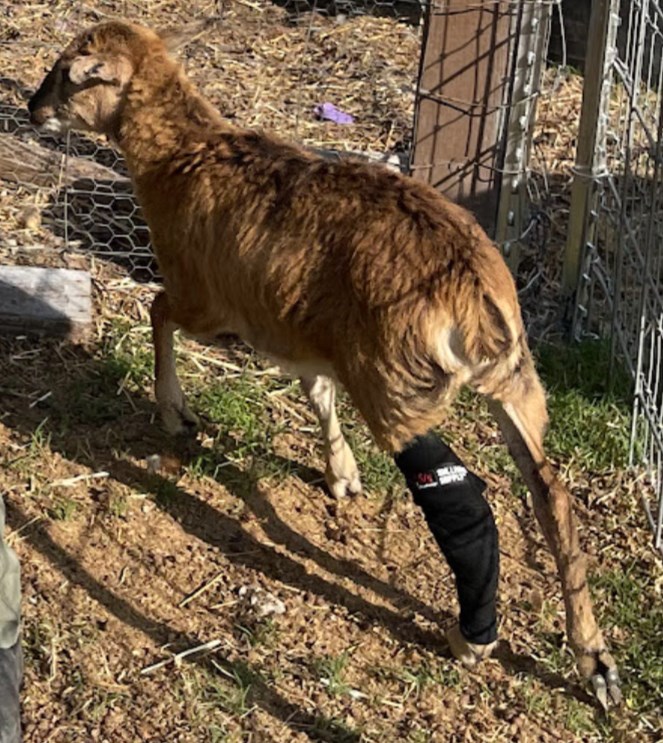 She pouted for an entire day. Hardly moved, wouldn’t eat, not even a treat! The second day, she realized that this was a new part of her wardrobe so she might as well get used to it. The idea of the dangle stick is that it keeps her from running. Her legs get tripped up in it so once she starts to run, she has to stop or she will fall down. This discourages her from chasing the sheep. We also added verbal reinforcements as well. When we saw her walk past the sheep without engaging with them, we told her “good girl”. If we saw her going towards the sheep, we would say in a stern voice “stay away from the sheep”. She can protect the sheep without interacting with them. She wore the dangle stick 24/7 for about 10 days. Long enough for Gherkins legs to heal from Frostee’s bites 😥