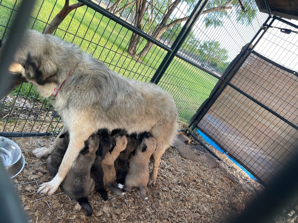 When Lacey became pregnant, Blue started to become a little aggressive towards her. Omar was worried that Blue might hurt her or the babies. We offered for him to bring Lacey to our paddock and empty kennel. Since we are both home most of the time, we could keep an eye on her and she and the puppies would be safe from Blue or any predators. In exchange, Omar would let us have pick of the litter.