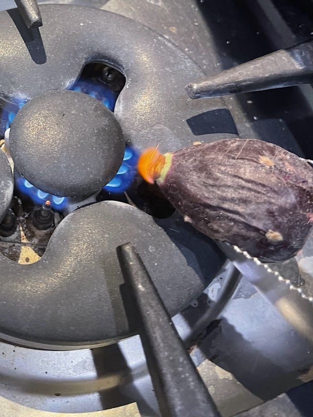 Making prickly pear anything is a MESS. If you’ve ever worked with pomegranates or beets, it’s the same principle. You’re going to be red no matter what you do. To prepare the fruit for juice, you begin by burning off the glochids (needles). You can use your gas stove (which is how I started) or you can use a torch (which is what I did after about 10 pieces and a cramped hand).