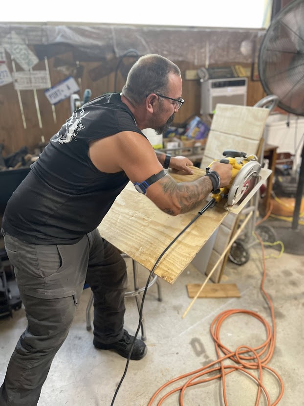 He decided that it should be in two parts, to make it easier to move. It was very heavy! Once it was all built, it was time for paint.