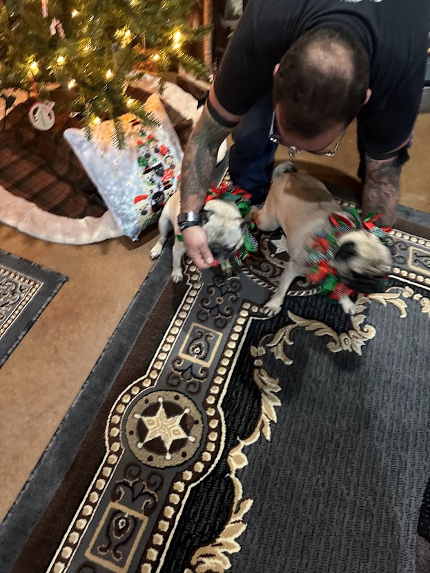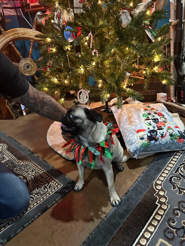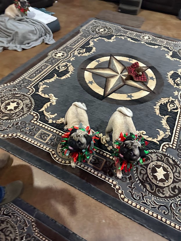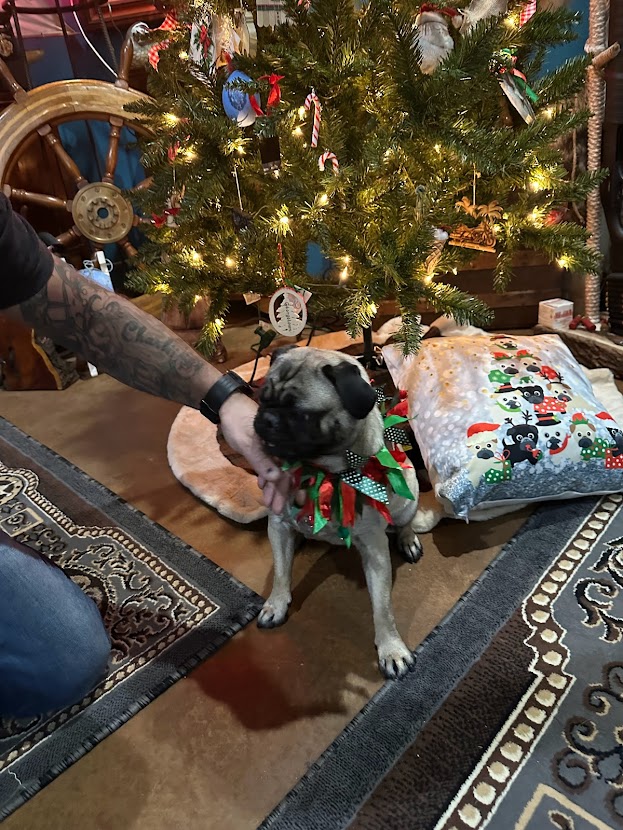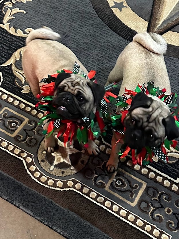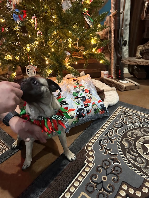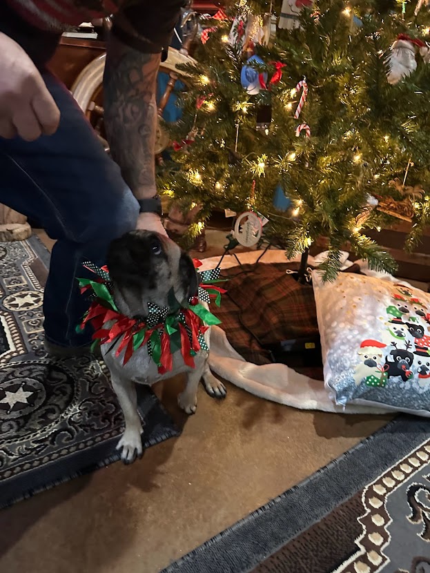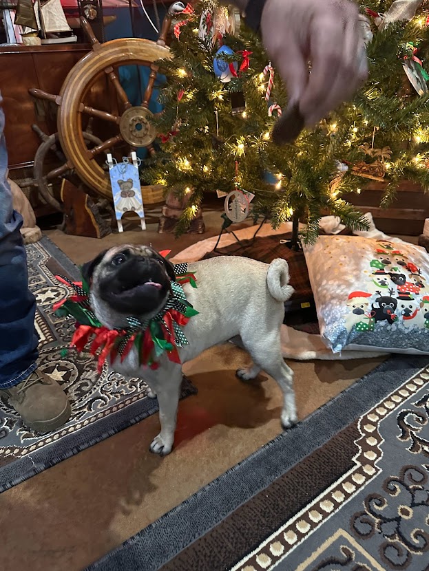 This year, we decided to have the pugs join in on the fun. I ordered them these cute little collars made of Christmas ribbon. Surely it wouldn’t be too hard to get one photo of all three of them, would it??