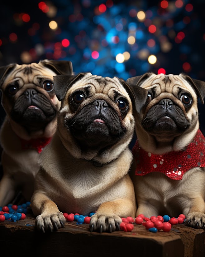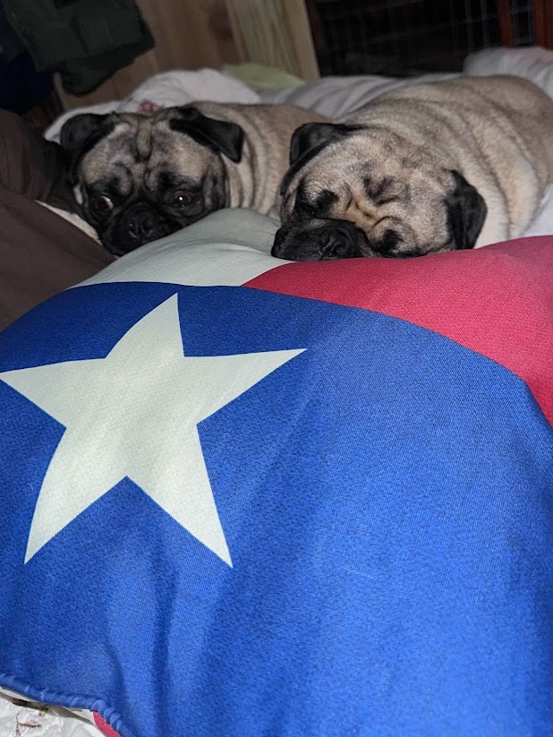 There is a small pug community on Twitter that we are part of. One of the participants is a graphic artist and runs an Etsy shop selling pug art, clothing, etc. (You can find her shop here!) For the 4th of July, she was offering her services to create a 4th of July-themed digital portrait of your pugs for a small fee. We had her make one of the pugs, it came out so cute!