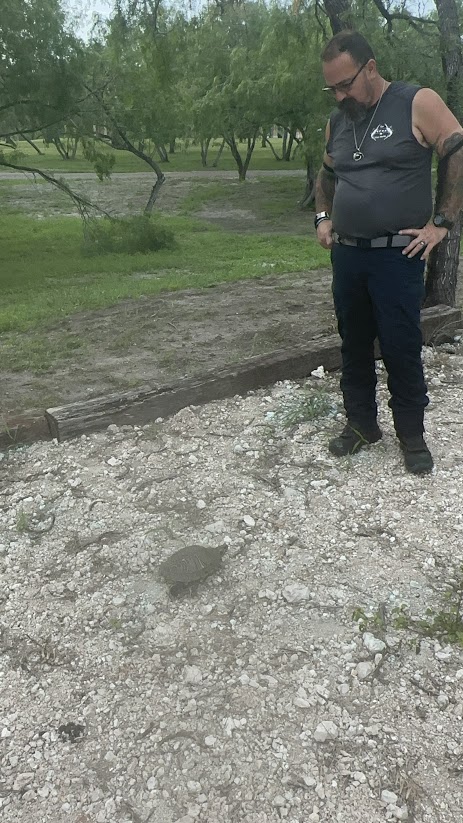 Rain always brings turtles out. Usually we see them in the road. If it’s safe, we pull over and help them to the side of the road so they don’t get hit. This day, we found one in the driveway so we helped him to the pond next door.