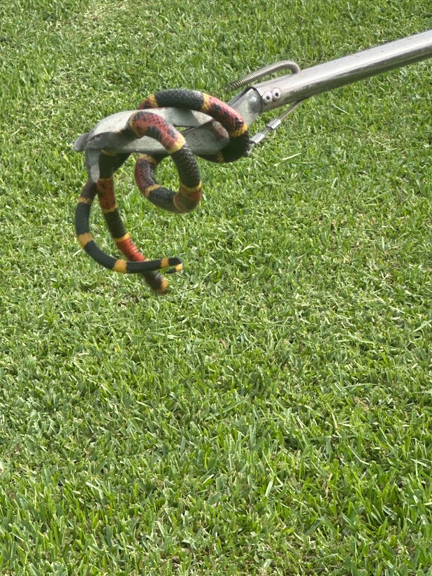 You would think that with all of the brush and overgrowth on the new property that Josh would see a bunch of snakes, rats, etc. but he didn’t! He said he only saw one rat the whole time he was working there. We were pretty much finished trimming up the property and I was out talking to Josh during my lunch break. I turned to go back inside, and guess what I saw curled up next to the foundation of our garage… a poisonous Coral snake! Josh taught me a rhyme to be able to identify if it is a Coral snake or a similar-looking King snake: “Red on yellow, kill a fellow. Red on black, friend of Jack”. This means if the bands on the snake have red next to yellow, you better run! Or in Josh’s case, get the snake grabber 😂